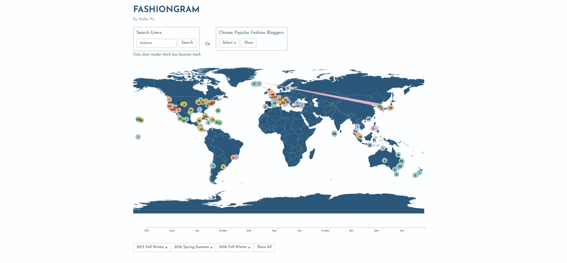 This project shows world-wide famous fashion bloggers' posts during sevaral specific fashion weeks. Many interactive functions are designed to help user get more detail information. These bloggers' Instagram posts are displayed on the main map. Users could also use the timeline to filter posts by dates. (Co-op with Xinhe Yu)